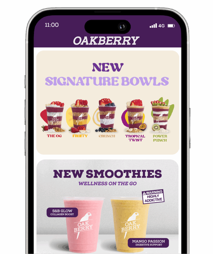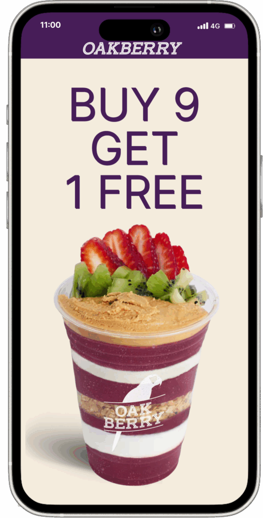 OAKBERRY Club WELCOME TO THE Join our loyalty program and get rewarded every timeyou enjoy your favourite açaí bowls and smoothies. T REAT SON REPEAT Collect stamps& get FREE Bowlsor Smoothies Welcome gift Sign up & get $10 OFFyour first OAKBERRY BUY 9GET 1 FREE Get the App Download today & fuelyour day the OAKBERRY way Find out more below FAQs CONTACT US GET THE APP